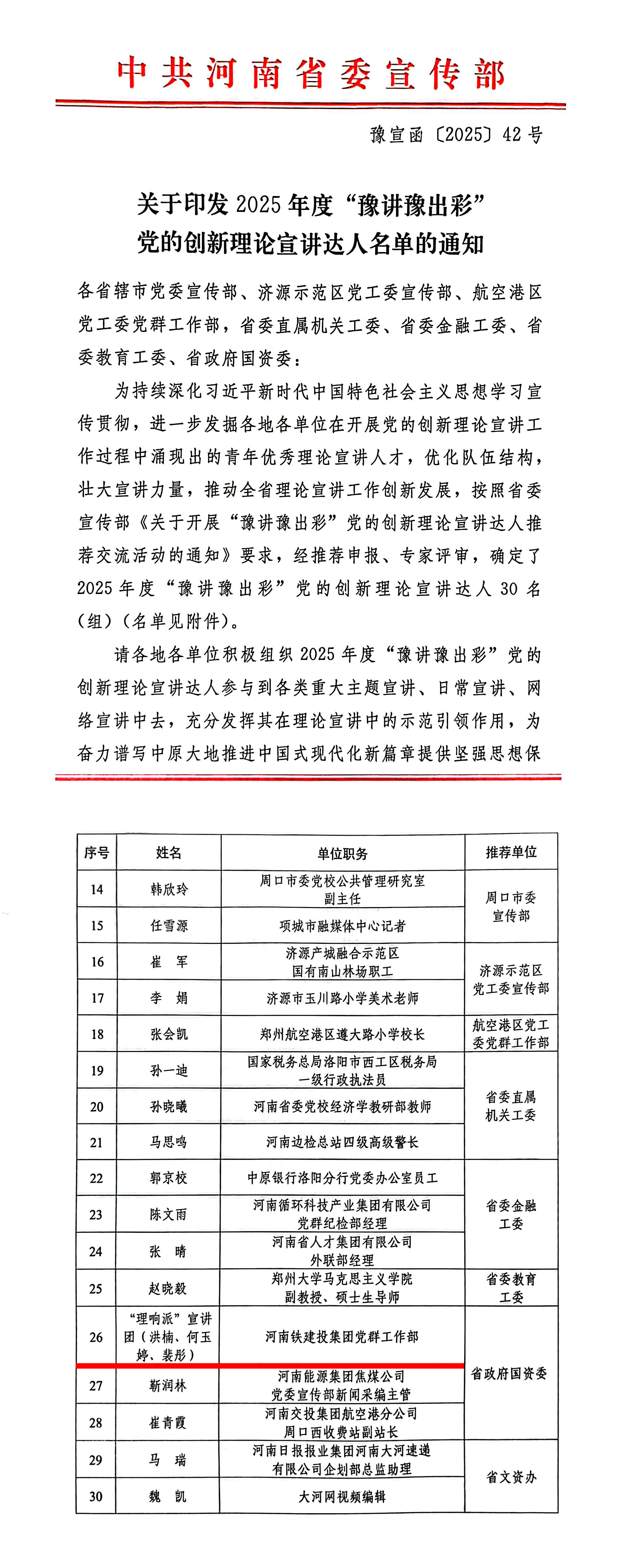 近日,按照省委宣傳部《關于開展“豫講豫出彩”黨的創新理論宣講達人推薦交流活動的通知》要求,經推薦申報、專家評審,河南鐵建投集團“理響派”宣講團(洪楠、何玉婷、裴彤)成功入選2025年度“豫講豫出彩”黨的創新理論宣講達人。